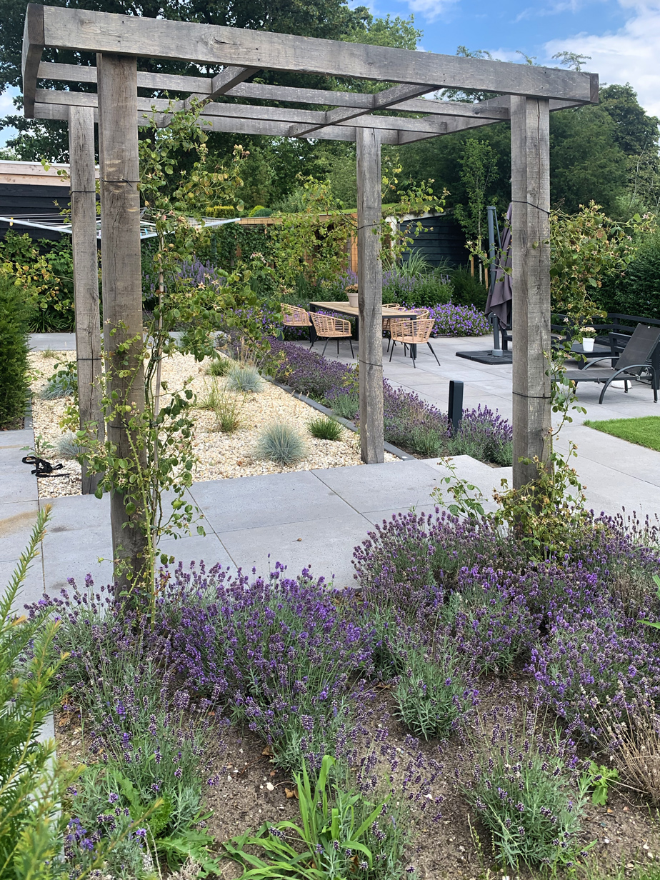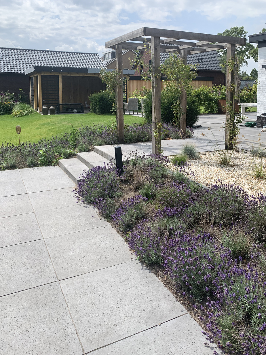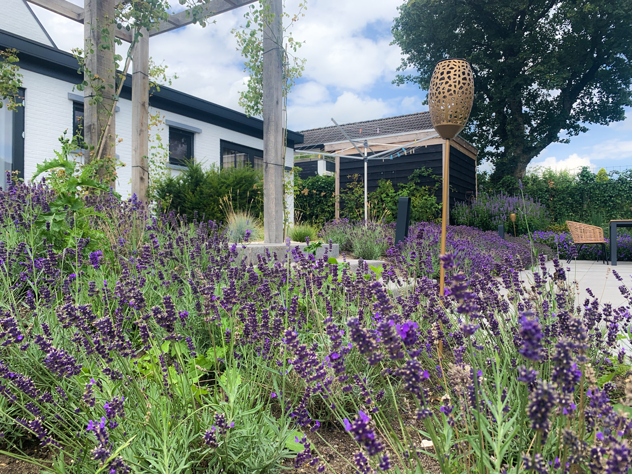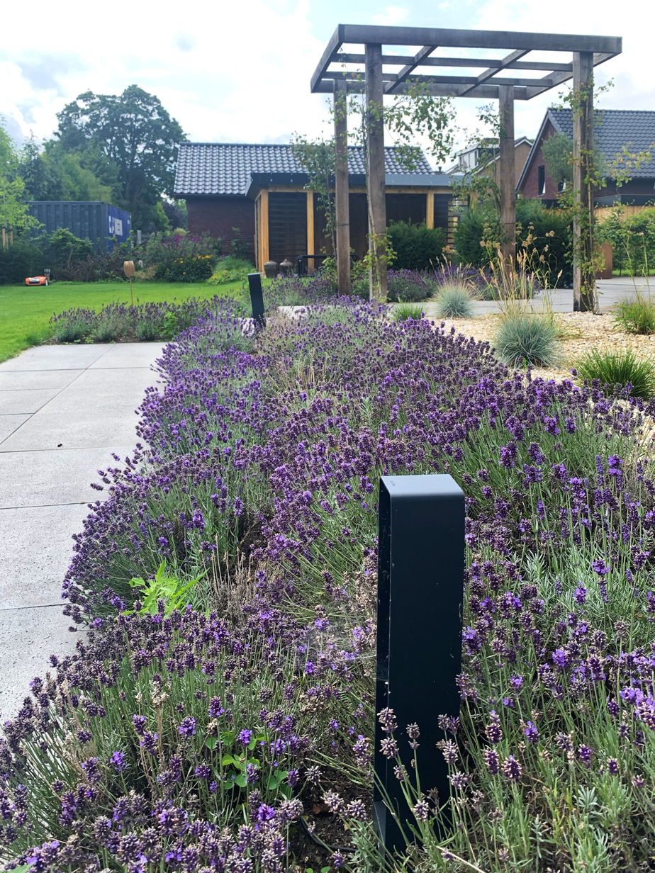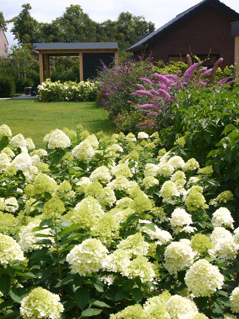 In de tuin zijn meerdere witte Lime Light Hortensia’s geplaatst, die mooi kleuren bij het huis. De tuin is voorzien van acht grote Taxus kubussen en acht bloesembomen die in een periode van november tot mei de tuin voorzien van kleur. Daarnaast hebben we een gazon aangelegd, borders van lavendel geplant, maar ook een vlinderstruik en bij- lokkende beplanting en lang bloeiende vaste planten geplant gecombineerd met siergrassen.