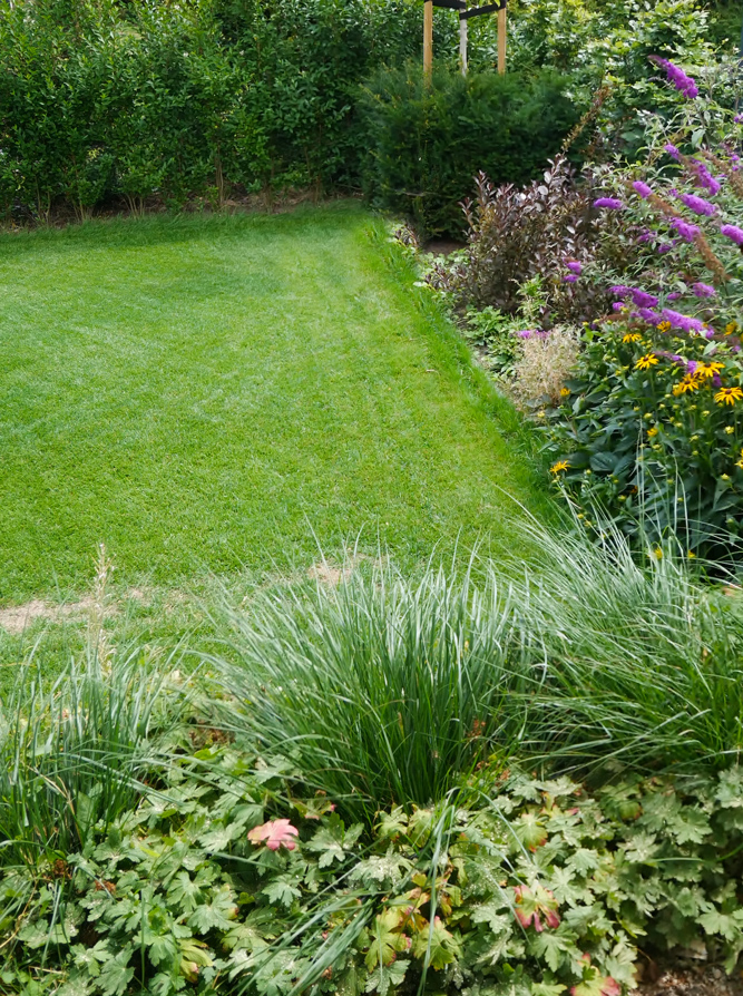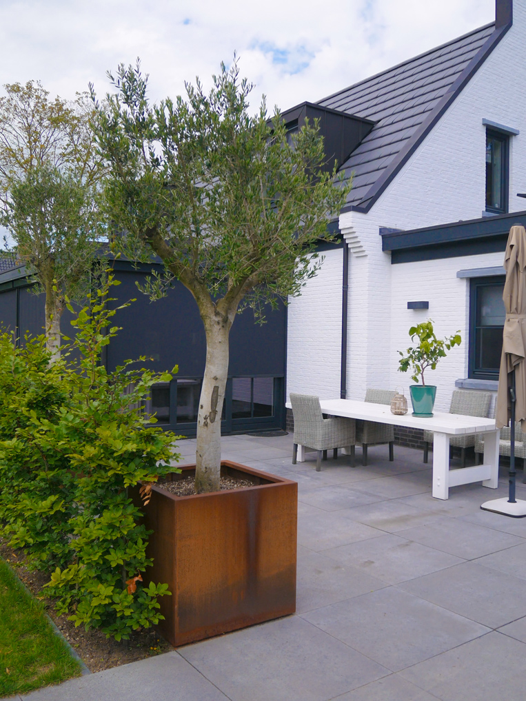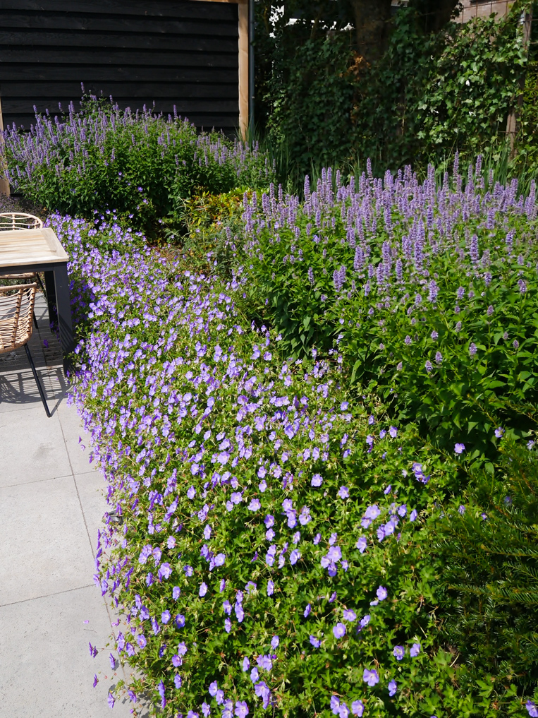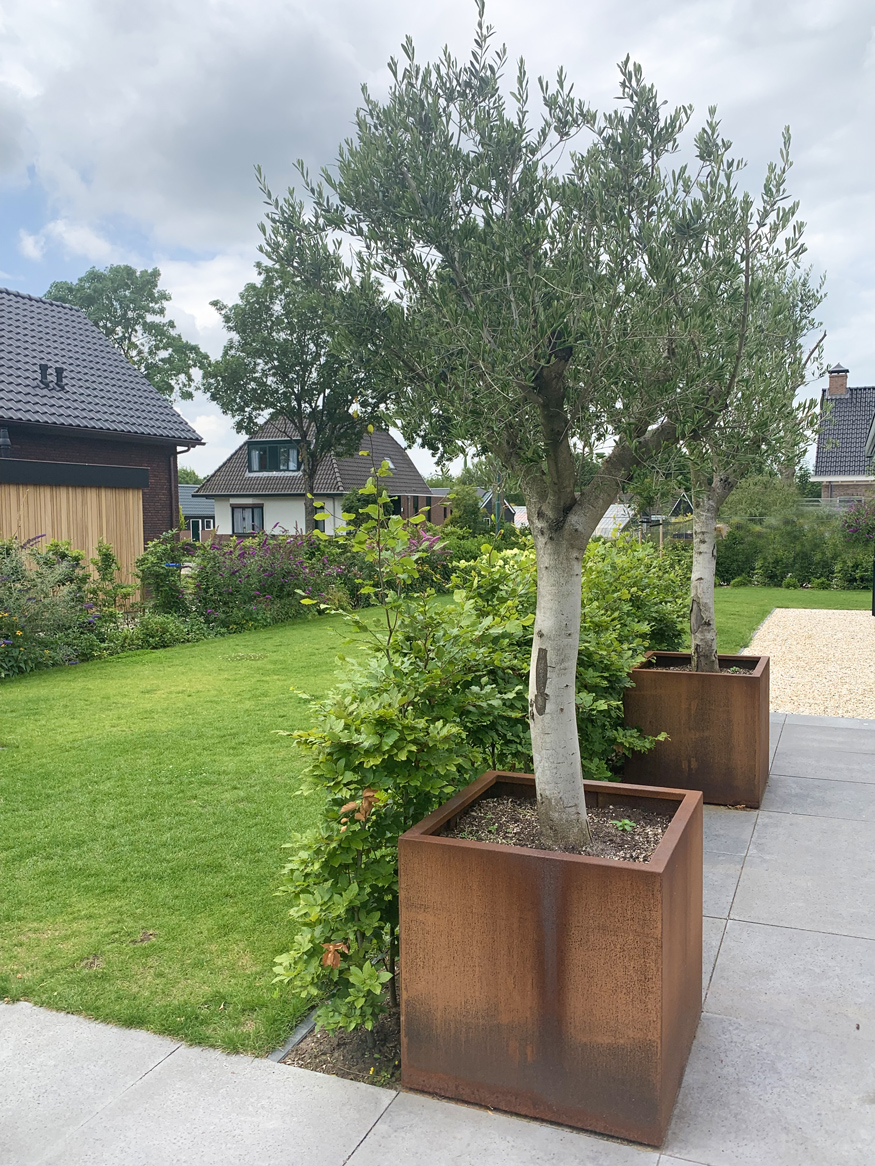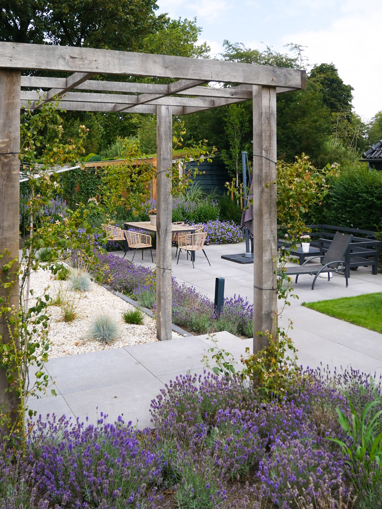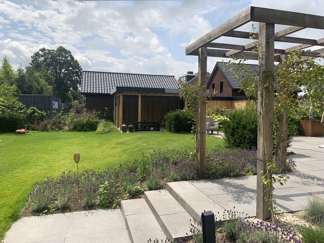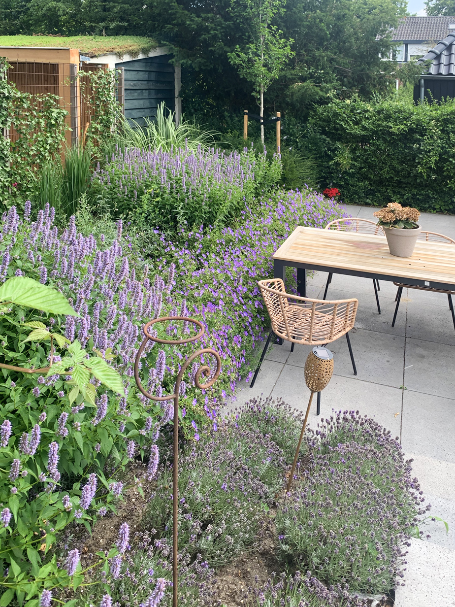 In de tuin zijn meerdere witte Lime Light Hortensia’s geplaatst, die mooi kleuren bij het huis. De tuin is voorzien van acht grote Taxus kubussen en acht bloesembomen die in een periode van november tot mei de tuin voorzien van kleur. Daarnaast hebben we een gazon aangelegd, borders van lavendel geplant, maar ook een vlinderstruik en bij- lokkende beplanting en lang bloeiende vaste planten geplant gecombineerd met siergrassen.